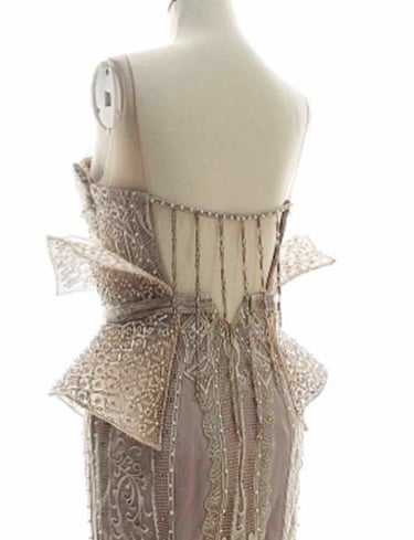 A celebration of form and finesse, this nude-toned mermaid gown clings with regal intent—its baroque lace wrapping the body like a whispered symphony of opulence. Anchored by a sculptural beaded obi belt and ethereal silhouette.
