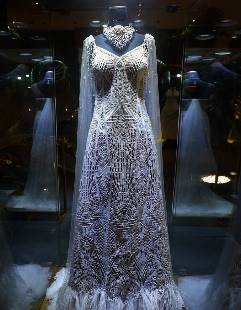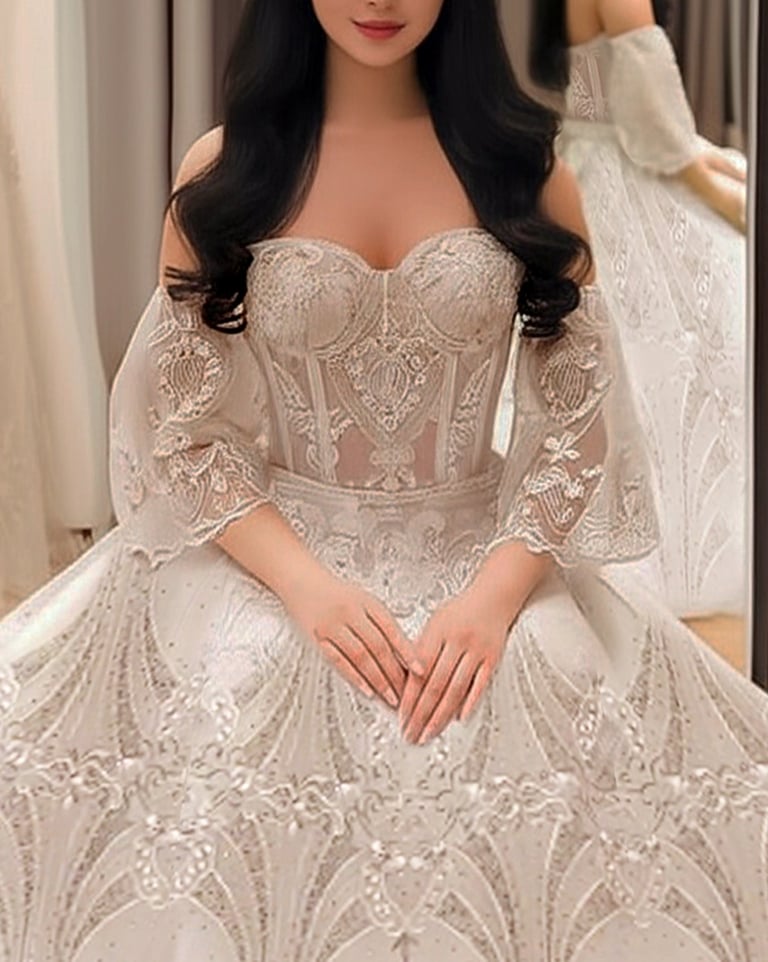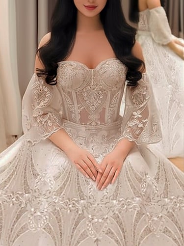 A vision where eras collide in semi-ballgown marries baroque classicism with futuristic artistry through intricate patterned lace. The bell sleeves add an old-world charm, while the silhouette remains refreshingly modern.