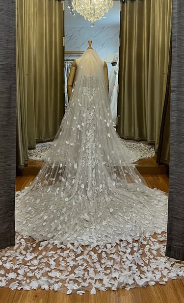 A romantic masterpiece woven with delicacy, blossoms with 3D floral appliqués over layers of ethereal Chantilly lace. The sheer bohemian sleeves whisper elegance, while the flowing train adds a graceful finish to every step.