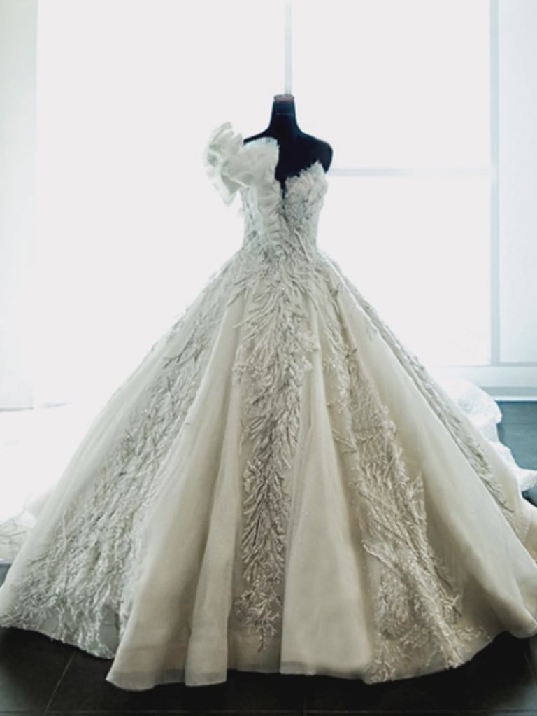 Abstract lace patterns dance across layers of intricate beading. The asymmetrical, sculptural bodice creates a modern statement, while the dramatic long train trails with grandeur.