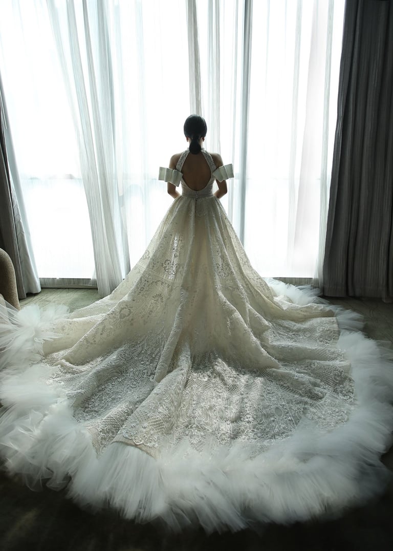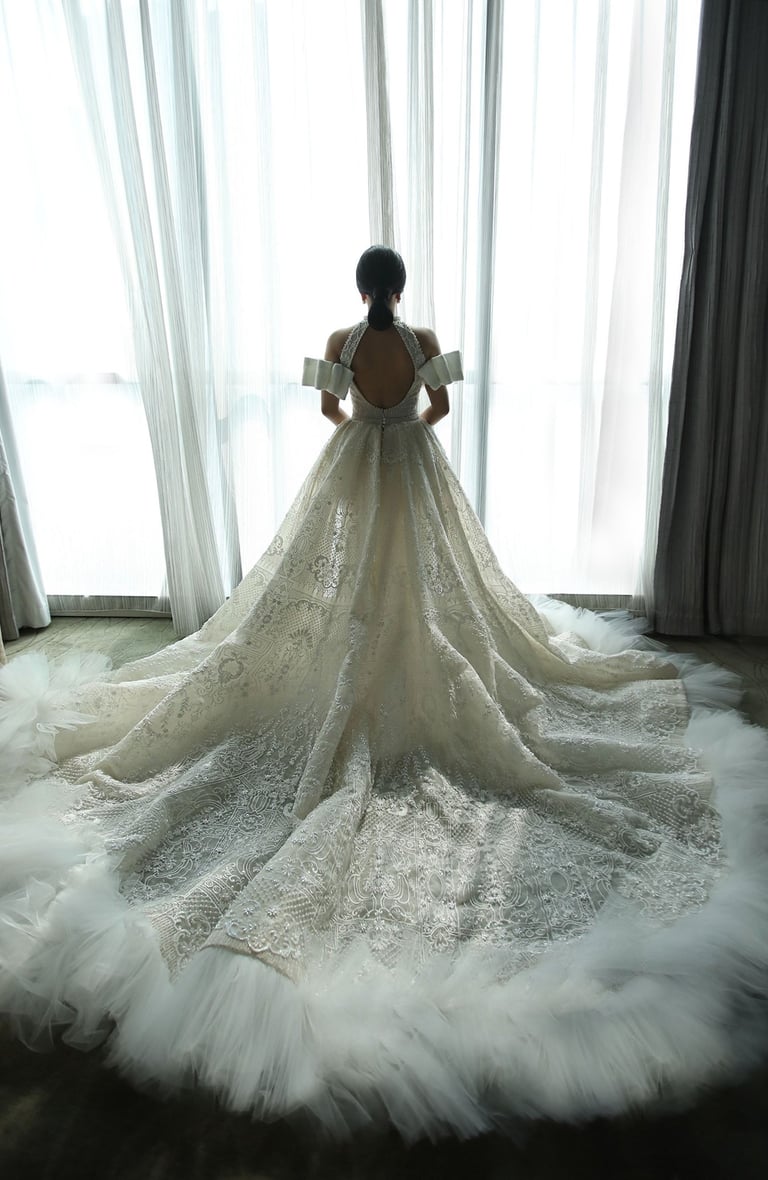 full lace and beaded gown with inner mermaid silhouette and delicate pearl detailing and a graceful halter neckline. Layered with a voluminous outer skirt edged in soft, cloudy tulle and finished with structured sleeve.