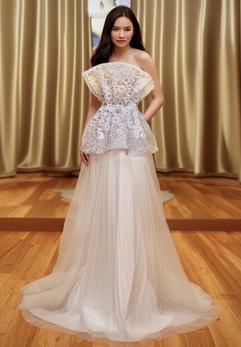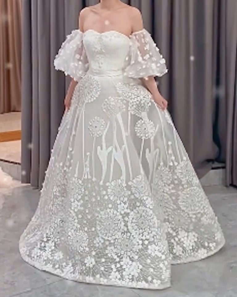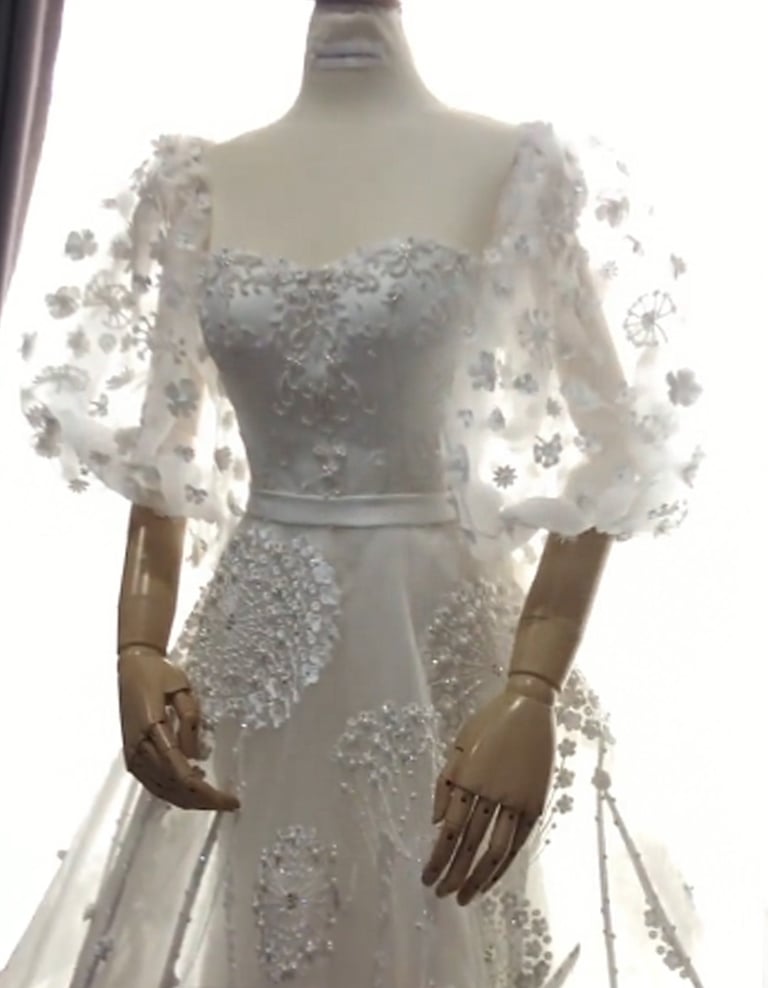 Mermaid inner dress and A-line ranslucent outer skirt adorned with soft dandelion motifs and airy balloon sleeves adds ethereal charm. Designed for graceful transitions