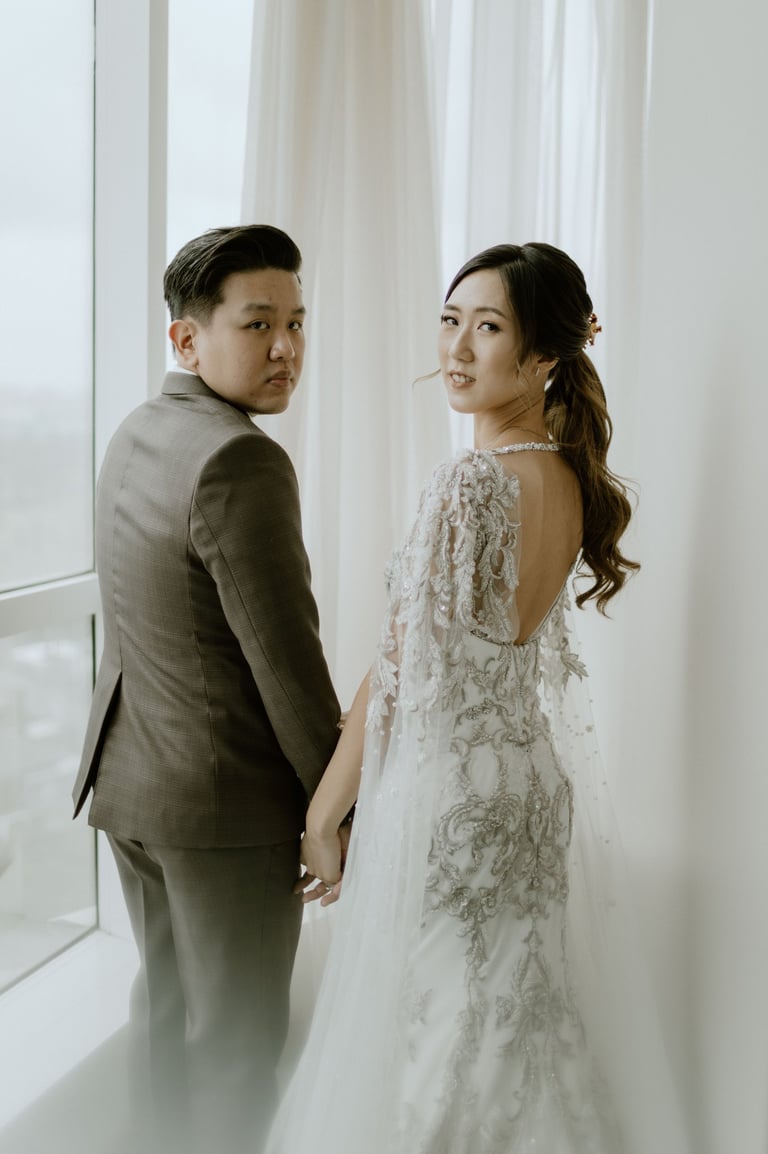 Minimalist wedding dress features masterful drapery and clean, structured lines. A celebration of quiet strength and effortless beauty, for the bride who finds power in simplicity
