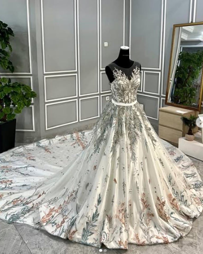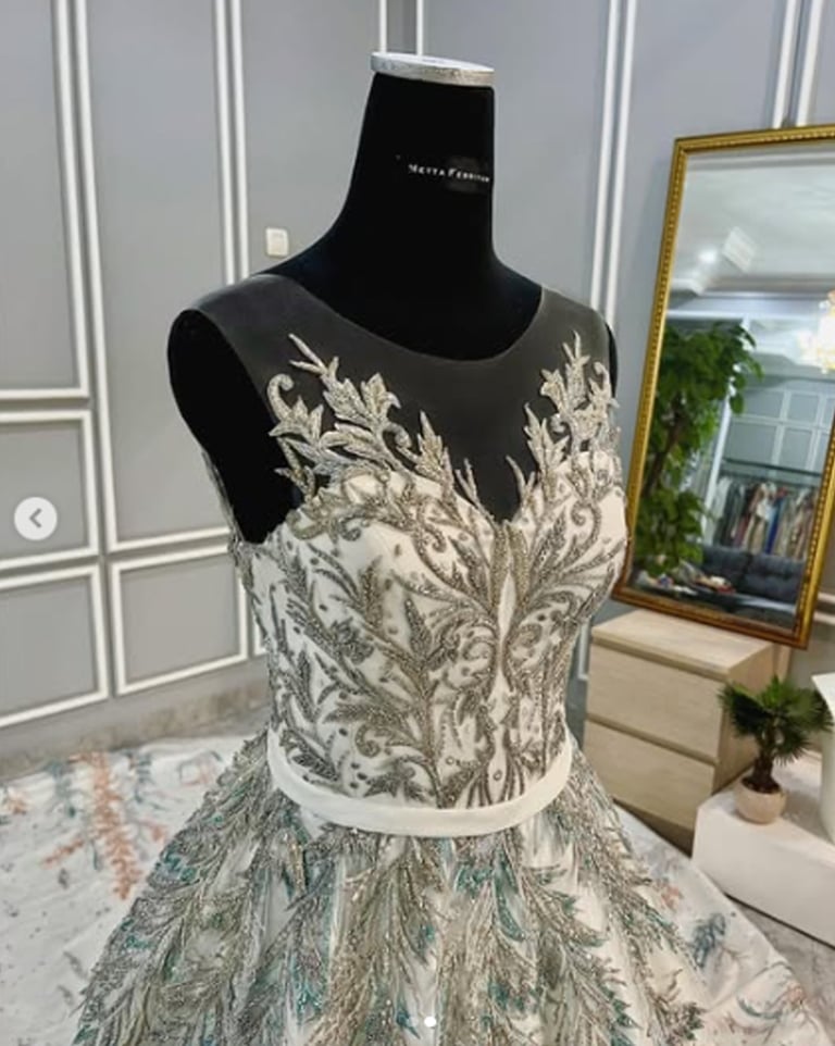 This grand wedding gown brought to life through intricate embroidery in silver grey, peach, and soft blue. It’s a modern fairytale woven in color bold, elegant, and anything but ordinary.