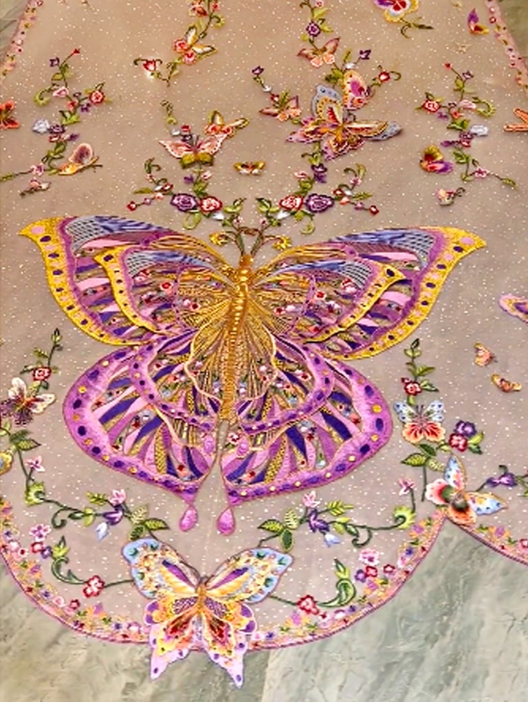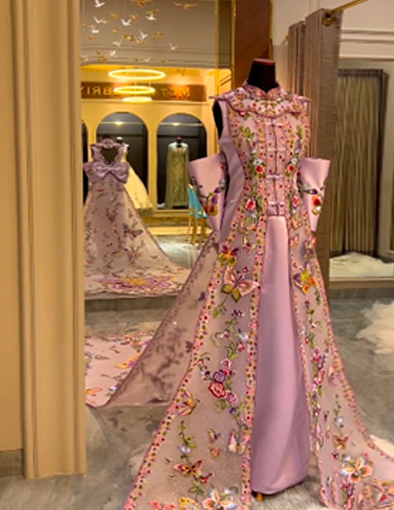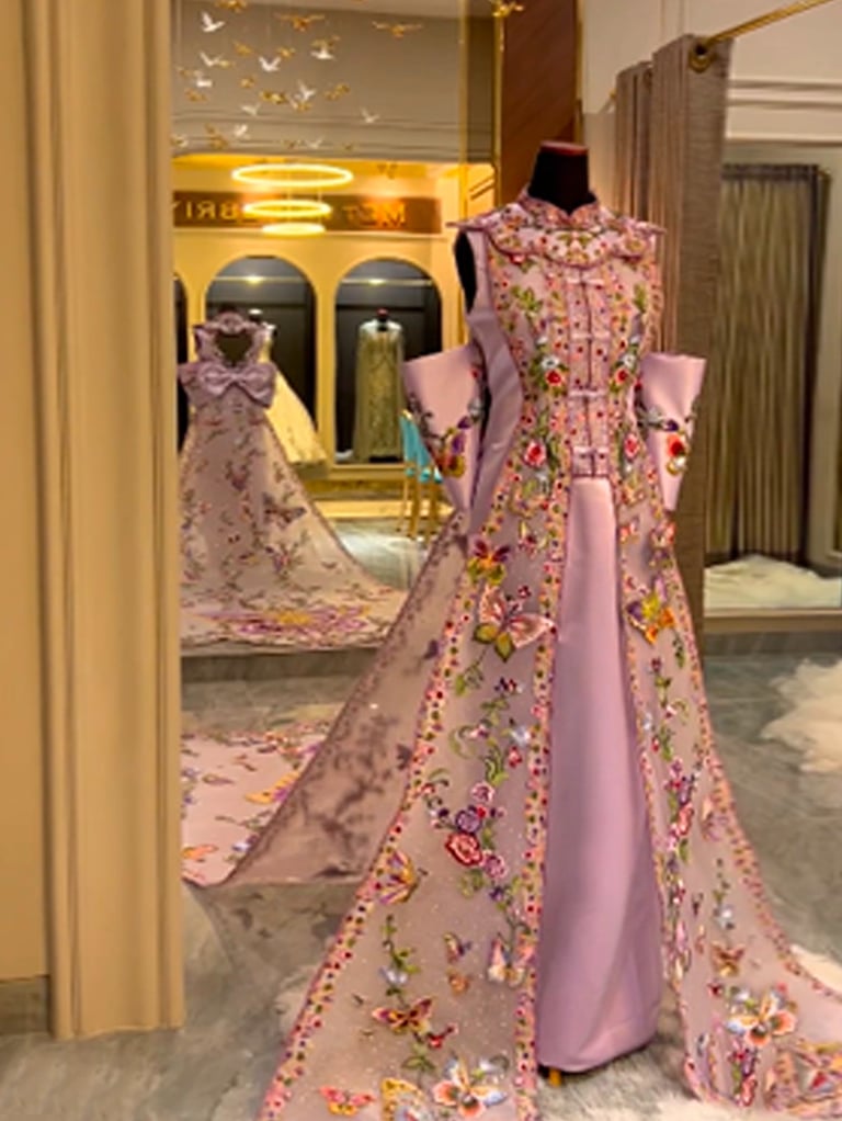Adorned with delicate embroidery of butterflies and blooming florals, this ethereal lilac gown unfurls like a fairytale in motion, regal silhouette, cascading train, and whimsical bow detail blend of grace with fantasy elegance.