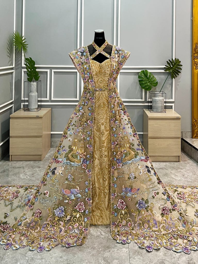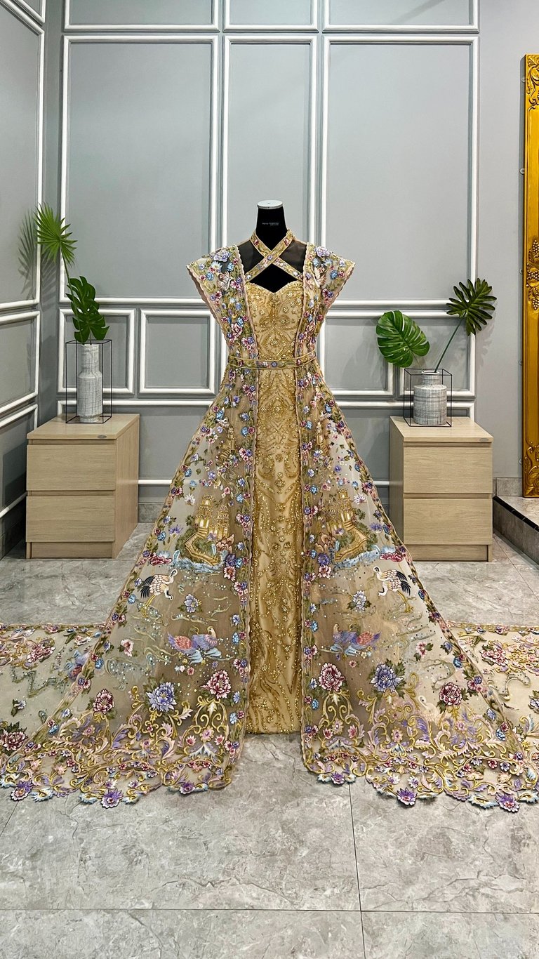 Drenched in opulence, this handcrafted champagne gown is a poetic tribute to Eastern elegance. Lavished with intricate embroidery of cranes, lotus blossoms, and gilded pagodas, each motif tells a timeless story of harmony and heritage. champagne gold lace and an embroidered outer, inspired by the serene beauty of a Kyoto crane garden. The crane, a symbol of longevity, peace, and harmony, mirrors the wearer’s refined yet graceful spirit, harmonious colors embody balance and tranquility.