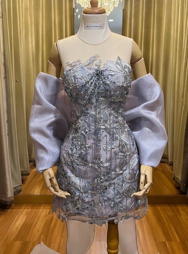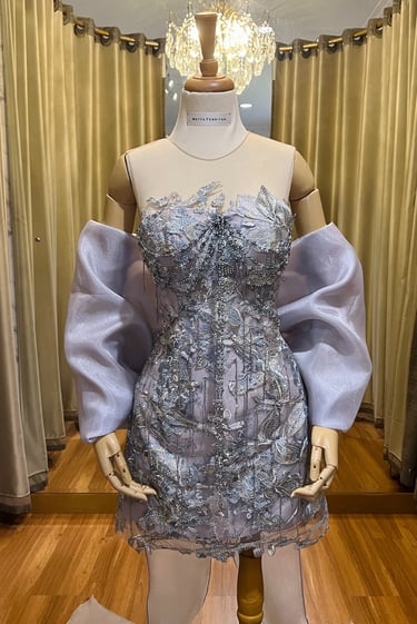An exquisite blend of intricate leaf motif and dazzling fringed beadworks. The silver-gold sheen is beautifully complemented by a subtle blue-ish tone. Suitable fot photoshoot, party, and after party.
