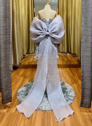 A celebration of serenity and prosperity. Its blush base, intricately detailed, is veiled by an ethereal overlay adorned with vibrant hand-embroidered koi fish and lotus blossoms, evoking the tranquil beauty of a water garden. A grand back bow adds a touch of elegance, while the twin train panels, featuring serene blue water elements and playful tassels, ensure a breathtaking departure. It's a garment designed for moments of grace and new beginnings.