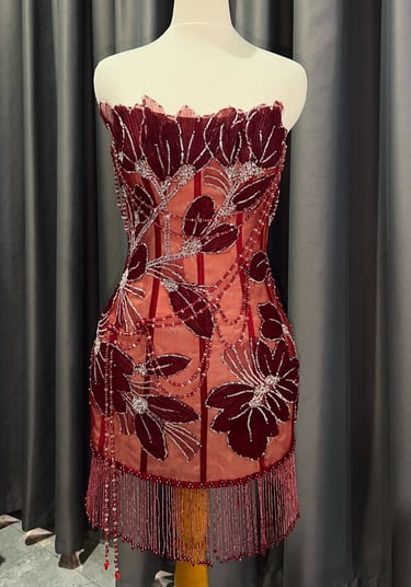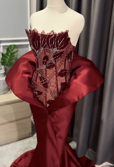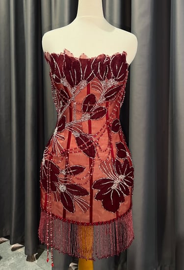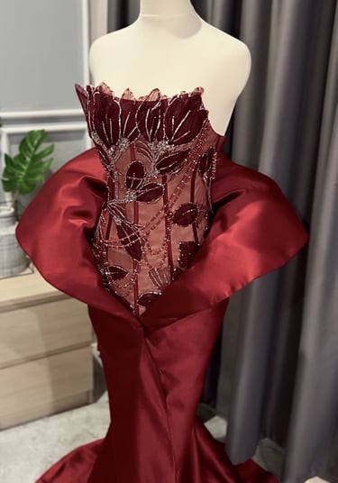Inspired by sculpted petals of Red Calla Lily, made as convertible silhouette. Detachable petal skirt reveals a hand-beaded mini dress beneath, giving you two looks in one masterpiece. Suitable fot photoshoot, party, and after party.