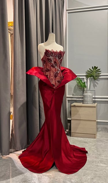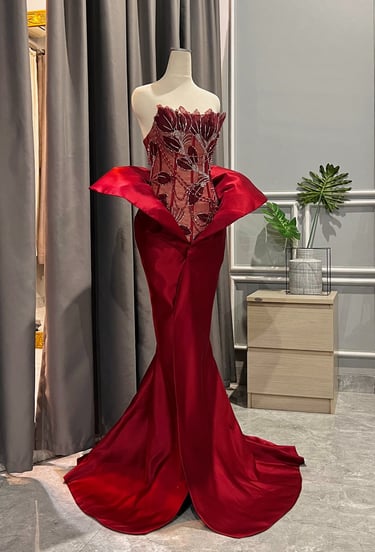 Velvet red gown, modern geometric beaded lace adorned with draped silk chiffon. A bold front slit outlined in intricate beadwork, captivating edge to the rich, textured design, making it a perfect harmony of structure and sensuality.