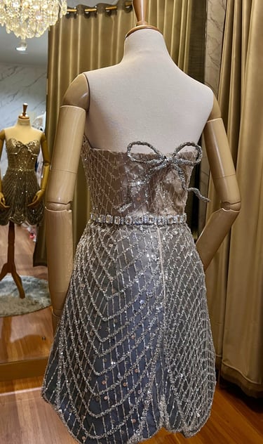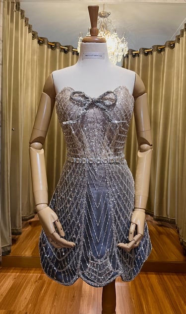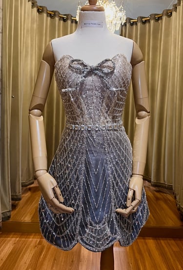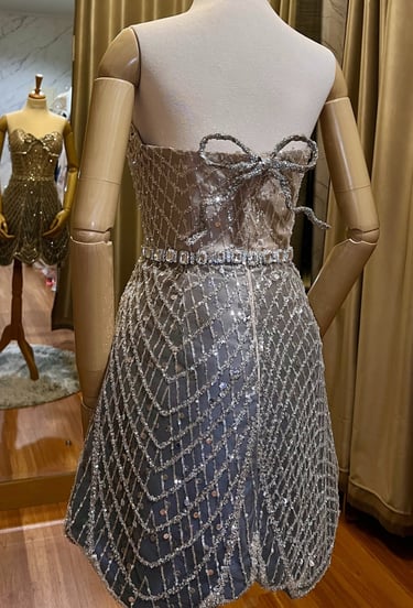 Sparkling ombre tones mini dress adorned with beadworks sculpted neckline and hem. Suitble for photoshoot, party and after party.